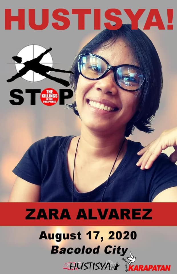 Zara Alvarez was een gezondheids- en mensenrechtenactiviste. Ze kwam op voor het Filipijnse volk en de strijd voor het recht op gezondheid en sociale rechtvaardigheid. Een strijd die ze niet opgaf ondanks intimidaties, arrestaties en doodsbedreigingen. Op 17 augustus 2020 werd Zara Alvarez op brutale wijze vermoord omwille van haar inzet in haar gemeenschap.